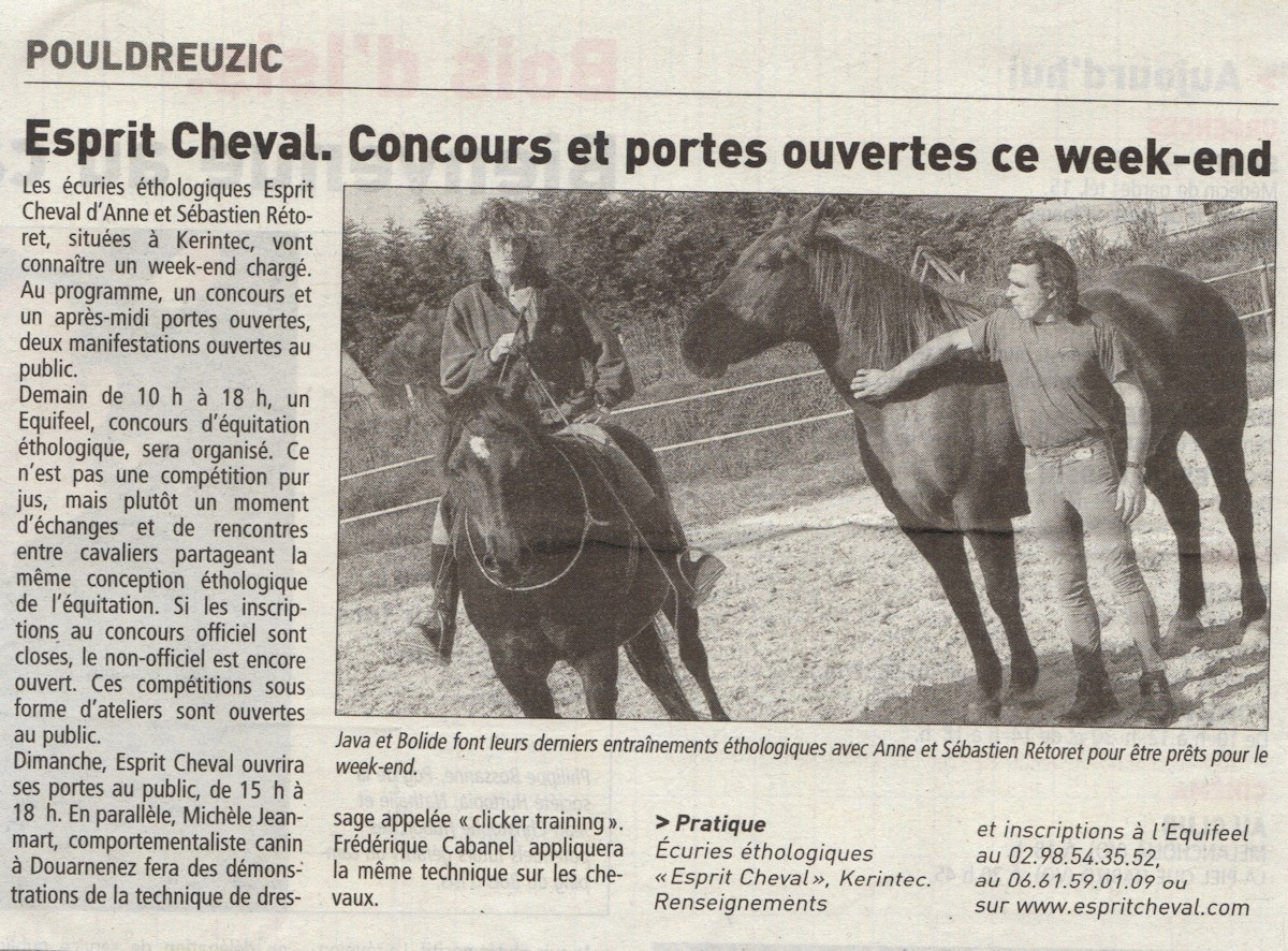 16 September 2011 de Esprit Cheval - Centre Équestre - Finistère 2545 0 0 LE TÉLÉGRAMME 16 SEPTEMBRE 2011 Categories: Actualités Esprit Cheval - Centre Équestre - Finistère Centre d’Equitation Comportementale et Intuitive en Bretagne, Esprit Cheval vous offre un lieu dévoué au Bien-être du cheval : cours, stage, pensions, services et conseils aux propriétaires. Contactez-nous pour plus d'informations.